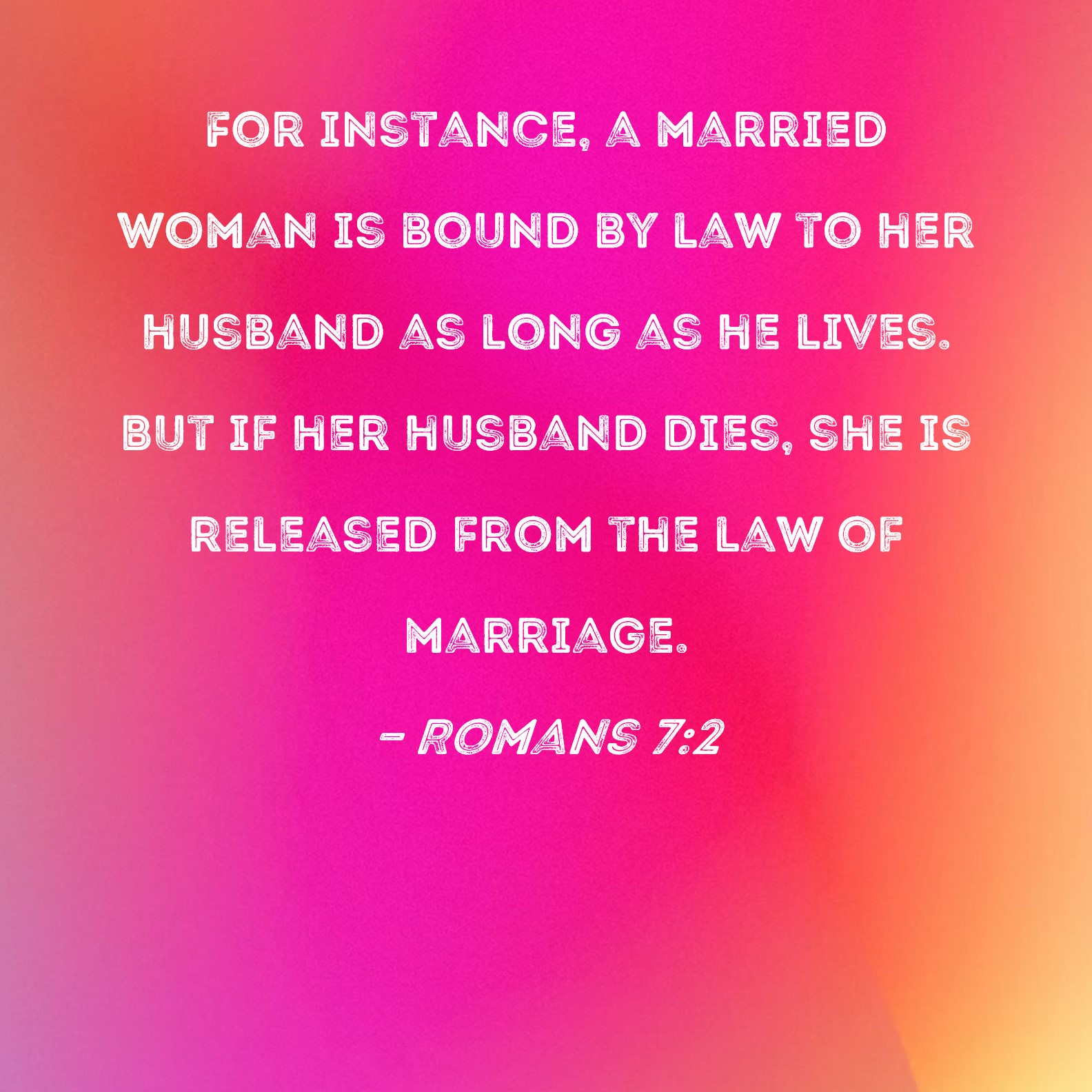 Romans 7:2 For instance, a married woman is bound by law to her husband as long as he lives. But if her husband dies, she is released from the law of marriage.