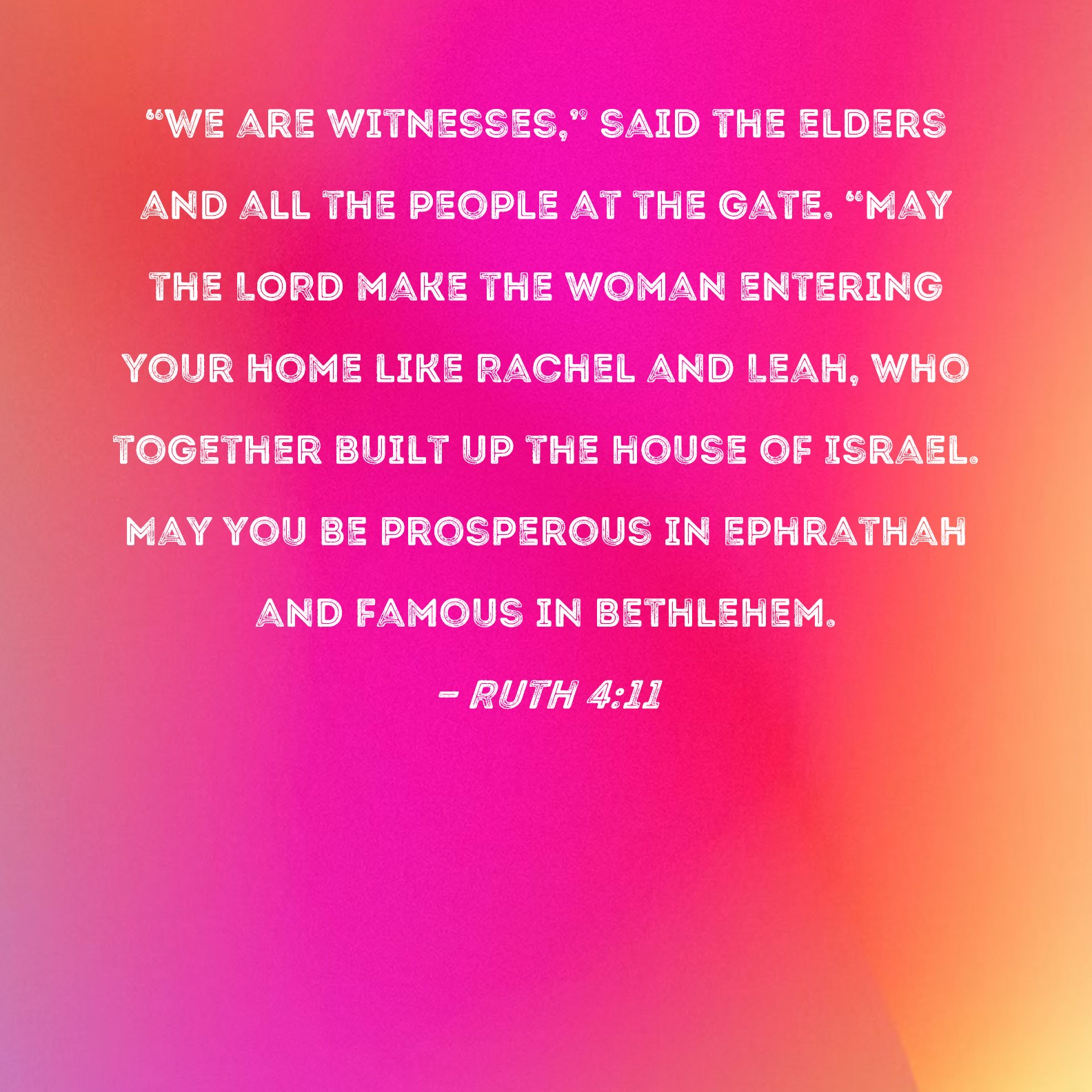 Ruth 4:11 "We are witnesses," said the elders and all the people at the gate. "May the LORD make the woman entering your home like Rachel and Leah, who together built up the house of Israel. May you be prosperous in Ephrathah and famous in Bethlehem.