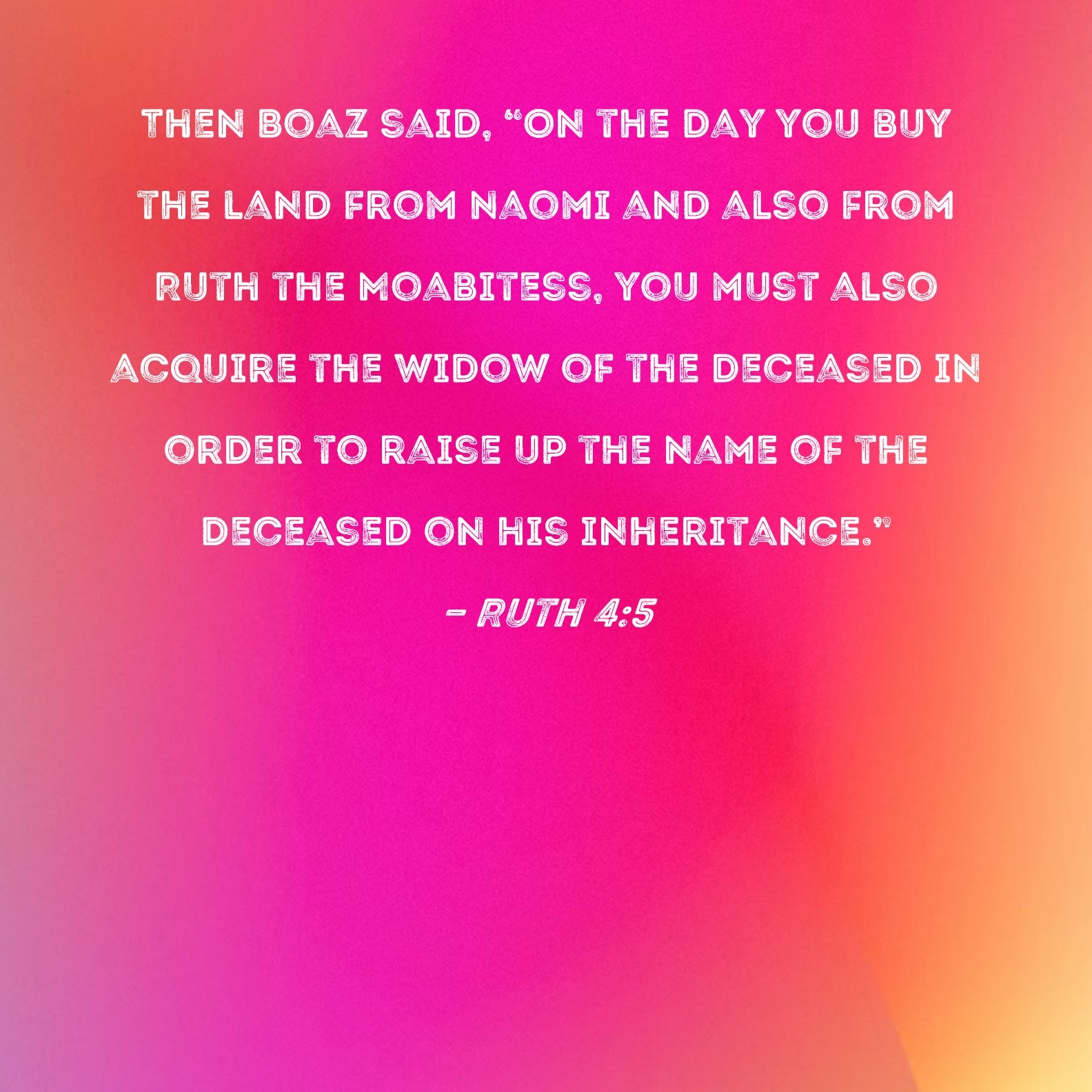 Ruth 4:5 Then Boaz said, "On the day you buy the land from Naomi and also from Ruth the Moabitess, you must also acquire the widow of the deceased in order to raise up the name of the deceased on his inheritance."