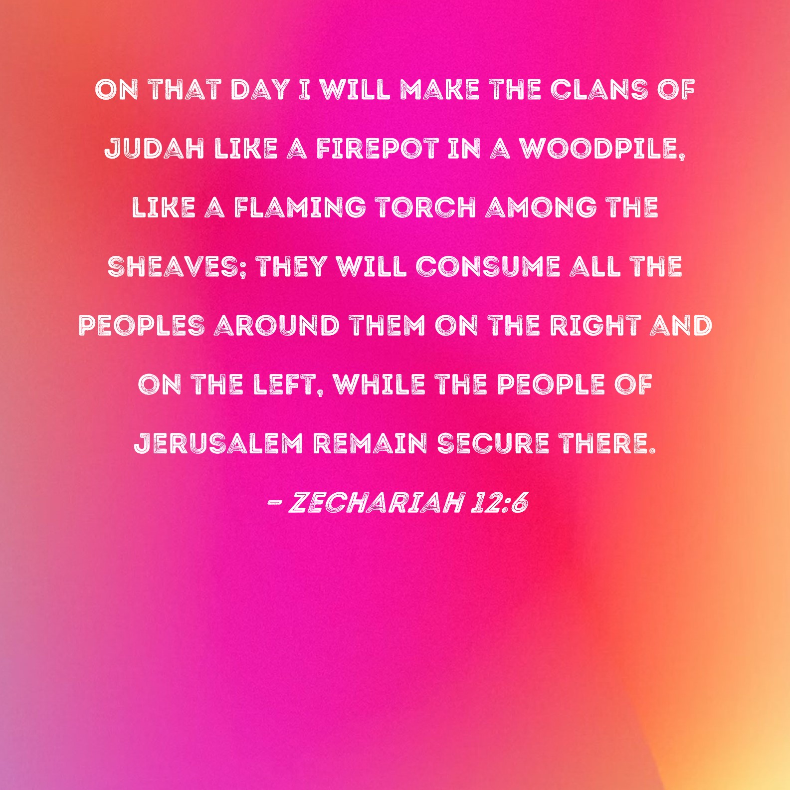 Zechariah 12:6 On that day I will make the clans of Judah like a firepot in a woodpile, like a flaming torch among the sheaves; they will consume all the peoples around them on the right and on the left, while the people of Jerusalem remain secure there.