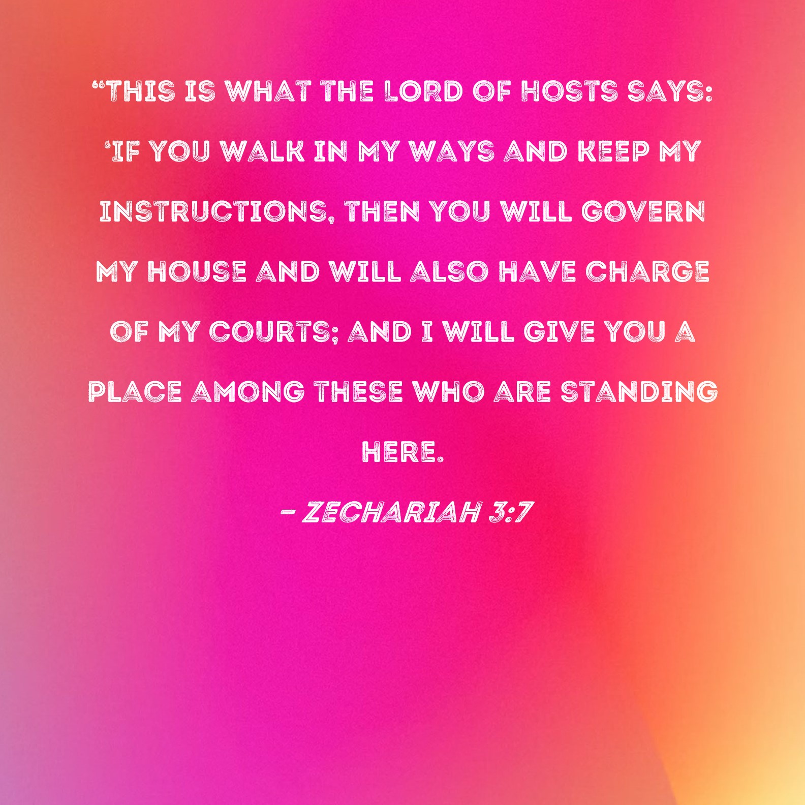 BSB: "This is what the LORD of Hosts says: 'If you walk in My ways and keep My instructions, then you will govern My house and will also have charge of My courts; and I will give you a place among these who are standing here. KJV: Thus saith the LORD of hosts; If thou wilt walk in my ways, and if thou wilt keep my charge, then thou shalt also judge my house, and shalt also keep my courts, and I will give thee places to walk among these that stand by. DRB: Thus saith the Lord of hosts: If thou wilt walk in my ways, and Beep my charge, thou also shalt judge my house, and shalt keep my courts, and I will give thee some of them that are now present here to walk with thee. DBT: Thus saith Jehovah of hosts: If thou wilt walk in my ways, and if thou wilt keep my charge, then thou shalt also judge my house, and shalt also keep my courts; and I will give thee a place to walk among these that stand by. ERV: Thus saith the LORD of hosts: If thou wilt walk in my ways, and if thou wilt keep my charge, then thou also shalt judge my house, and shalt also keep my courts, and I will give thee a place of access among these that stand by. WBT: Thus saith the LORD of hosts; If thou wilt walk in my ways, and if thou wilt keep my charge, then thou shalt also judge my house, and shalt also keep my courts, and I will give thee places to walk among these that stand by. WEB: “Yahweh of Armies says: ‘If you will walk in my ways, and if you will follow my instructions, then you also shall judge my house, and shall also keep my courts, and I will give you a place of access among these who stand by. YLT: 'Thus said Jehovah of Hosts: If in My ways thou dost walk, And if My charge thou dost keep, Then also thou dost judge My house, And also thou dost keep My courts, And I have given to thee conductors among these standing by.Links Zechariah 3:7 NIV • Zechariah 3:7 NLT • Zechariah 3:7 ESV • Zechariah 3:7 NASB • Zechariah 3:7 KJV • Zechariah 3:7 Interlinear • Zechariah 3:7 Commentaries • Zechariah 3:7 Parallel Texts • Zechariah 3:7 Bible Apps • Zechariah 3:7 Parallel • Bible Hub |
