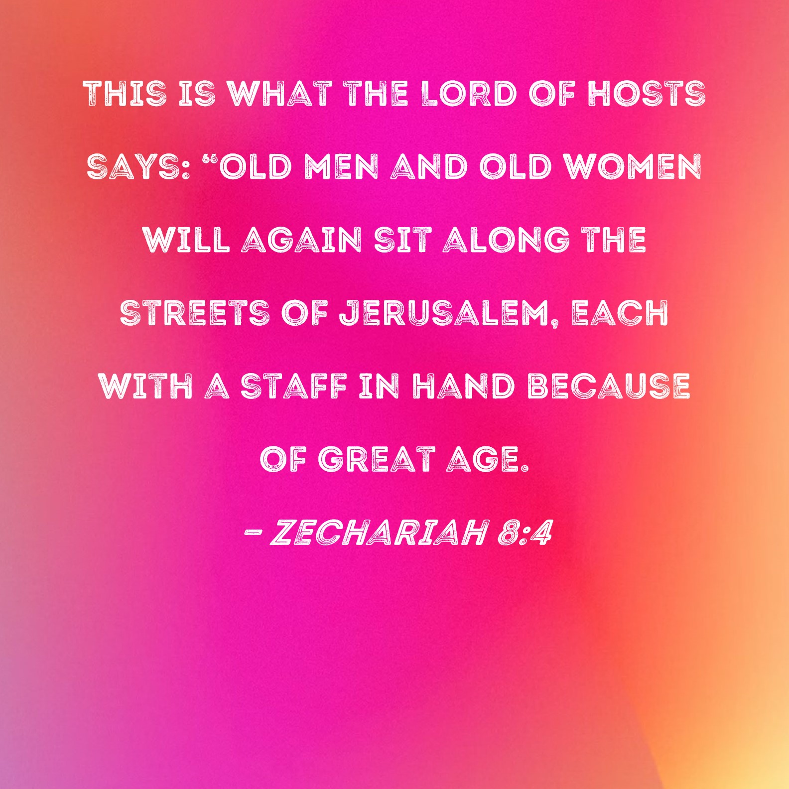 Zechariah 8:4 This is what the LORD of Hosts says: "Old men and old women will again sit along the streets of Jerusalem, each with a staff in hand because of great age.