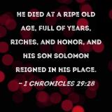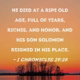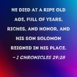 He died at a ripe old age, full of years, riches, and honor, and his son Solomon reigned in his place.