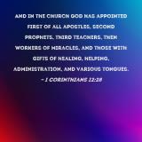 And in the church God has appointed first of all apostles, second prophets, third teachers, then workers of miracles, and those with gifts of healing, helping, administration, and various tongues.