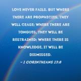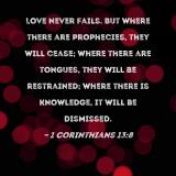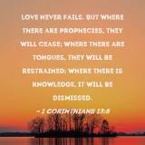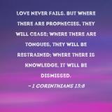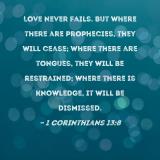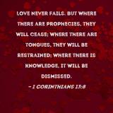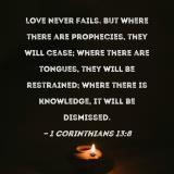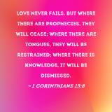 Love never fails. But where there are prophecies, they will cease; where there are tongues, they will be restrained; where there is knowledge, it will be dismissed.
