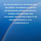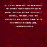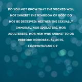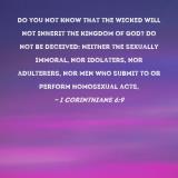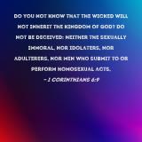 Do you not know that the wicked will not inherit the kingdom of God? Do not be deceived: Neither the sexually immoral, nor idolaters, nor adulterers, nor men who submit to or perform homosexual acts,