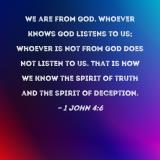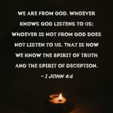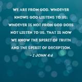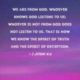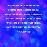 We are from God. Whoever knows God listens to us; whoever is not from God does not listen to us. That is how we know the Spirit of truth and the spirit of deception.