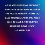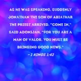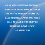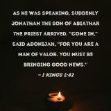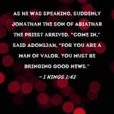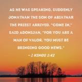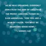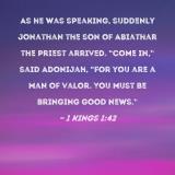As he was speaking, suddenly Jonathan the son of Abiathar the priest arrived. "Come in," said Adonijah, "for you are a man of valor. You must be bringing good news."