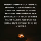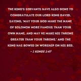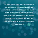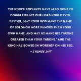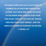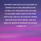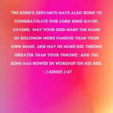 Pictures and Artwork The king's servants have also gone to congratulate our lord King David, saying, 'May your God make the name of Solomon more famous than your own name, and may He make his throne greater than your throne.' And the king has bowed in worship on his bed, |