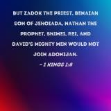 But Zadok the priest, Benaiah son of Jehoiada, Nathan the prophet, Shimei, Rei, and David's mighty men would not join Adonijah.