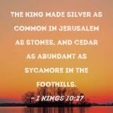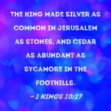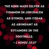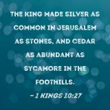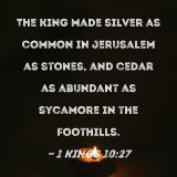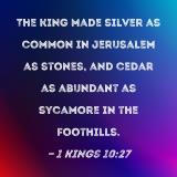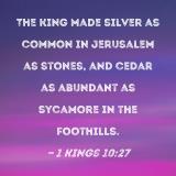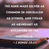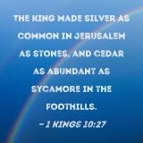The king made silver as common in Jerusalem as stones, and cedar as abundant as sycamore in the foothills.