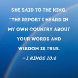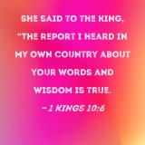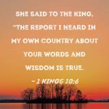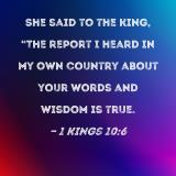 She said to the king, "The report I heard in my own country about your words and wisdom is true.