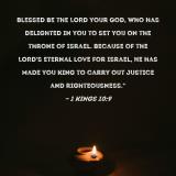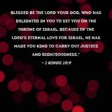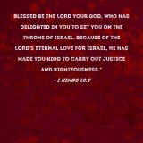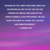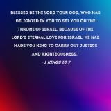 Blessed be the LORD your God, who has delighted in you to set you on the throne of Israel. Because of the LORD's eternal love for Israel, He has made you king to carry out justice and righteousness."