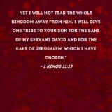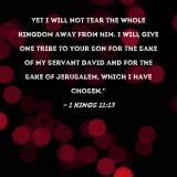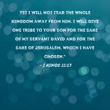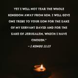 Yet I will not tear the whole kingdom away from him. I will give one tribe to your son for the sake of My servant David and for the sake of Jerusalem, which I have chosen."