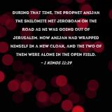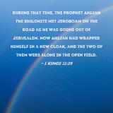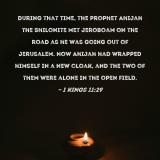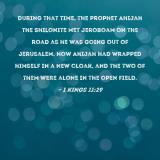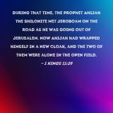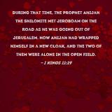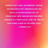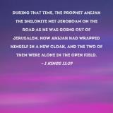 During that time, the prophet Ahijah the Shilonite met Jeroboam on the road as he was going out of Jerusalem. Now Ahijah had wrapped himself in a new cloak, and the two of them were alone in the open field.