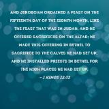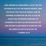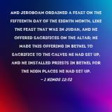 Pictures and Artwork And Jeroboam ordained a feast on the fifteenth day of the eighth month, like the feast that was in Judah, and he offered sacrifices on the altar; he made this offering in Bethel to sacrifice to the calves he had set up, and he installed priests in Bethel for the high places he had set up. |