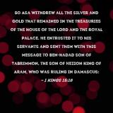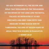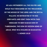 Pictures and Artwork So Asa withdrew all the silver and gold that remained in the treasuries of the house of the LORD and the royal palace. He entrusted it to his servants and sent them with this message to Ben-hadad son of Tabrimmon, the son of Hezion king of Aram, who was ruling in Damascus: |