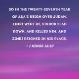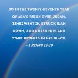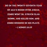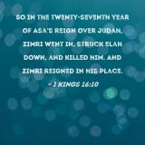 So in the twenty-seventh year of Asa's reign over Judah, Zimri went in, struck Elah down, and killed him. And Zimri reigned in his place.