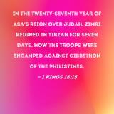 In the twenty-seventh year of Asa's reign over Judah, Zimri reigned in Tirzah for seven days. Now the troops were encamped against Gibbethon of the Philistines,
