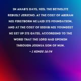 Pictures and Artwork In Ahab's days, Hiel the Bethelite rebuilt Jericho. At the cost of Abiram his firstborn he laid its foundation, and at the cost of Segub his youngest he set up its gates, according to the word that the LORD had spoken through Joshua son of Nun. |