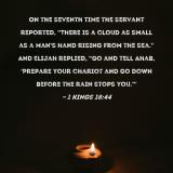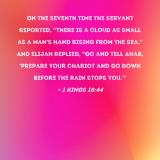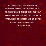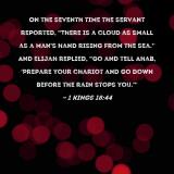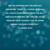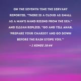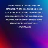 On the seventh time the servant reported, "There is a cloud as small as a man's hand rising from the sea." And Elijah replied, "Go and tell Ahab, 'Prepare your chariot and go down before the rain stops you.'"