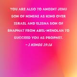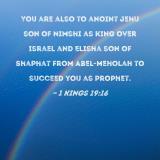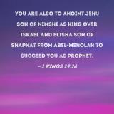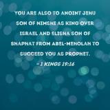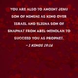 You are also to anoint Jehu son of Nimshi as king over Israel and Elisha son of Shaphat from Abel-meholah to succeed you as prophet.
