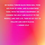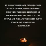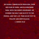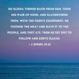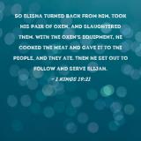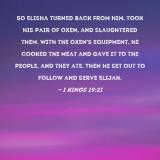 So Elisha turned back from him, took his pair of oxen, and slaughtered them. With the oxen's equipment, he cooked the meat and gave it to the people, and they ate. Then he set out to follow and serve Elijah.
