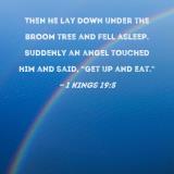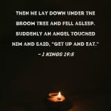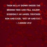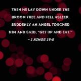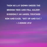 Then he lay down under the broom tree and fell asleep. Suddenly an angel touched him and said, "Get up and eat."