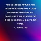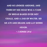 And he looked around, and there by his head was a cake of bread baked over hot coals, and a jar of water. So he ate and drank and lay down again.