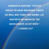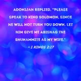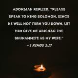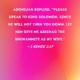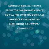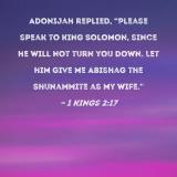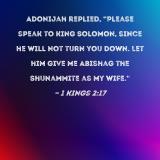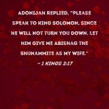 Adonijah replied, "Please speak to King Solomon, since he will not turn you down. Let him give me Abishag the Shunammite as my wife."