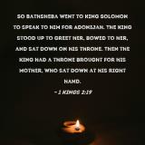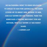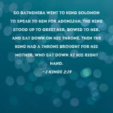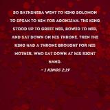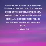 So Bathsheba went to King Solomon to speak to him for Adonijah. The king stood up to greet her, bowed to her, and sat down on his throne. Then the king had a throne brought for his mother, who sat down at his right hand.