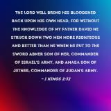 Pictures and Artwork The LORD will bring his bloodshed back upon his own head, for without the knowledge of my father David he struck down two men more righteous and better than he when he put to the sword Abner son of Ner, commander of Israel's army, and Amasa son of Jether, commander of Judah's army. |