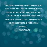 the king summoned Shimei and said to him, "Did I not make you swear by the LORD and warn you, 'On the day you leave and go elsewhere, know for sure that you will die'? And you told me, 'The sentence is fair; I will comply.'