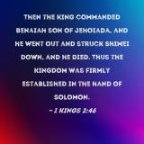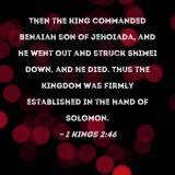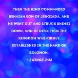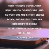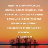 Then the king commanded Benaiah son of Jehoiada, and he went out and struck Shimei down, and he died. Thus the kingdom was firmly established in the hand of Solomon.