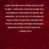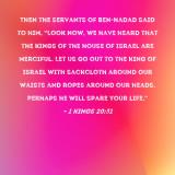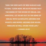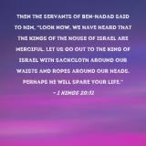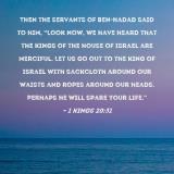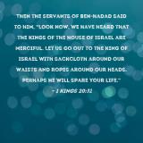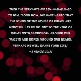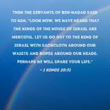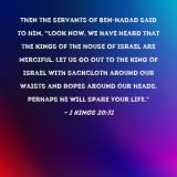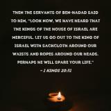 Pictures and Artwork Then the servants of Ben-hadad said to him, "Look now, we have heard that the kings of the house of Israel are merciful. Let us go out to the king of Israel with sackcloth around our waists and ropes around our heads. Perhaps he will spare your life." |