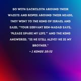 So with sackcloth around their waists and ropes around their heads, they went to the king of Israel and said, "Your servant Ben-hadad says, 'Please spare my life.'" And the king answered, "Is he still alive? He is my brother."