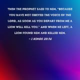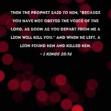 Then the prophet said to him, "Because you have not obeyed the voice of the LORD, as soon as you depart from me a lion will kill you." And when he left, a lion found him and killed him.