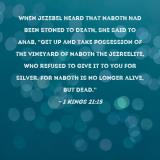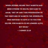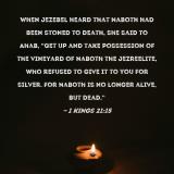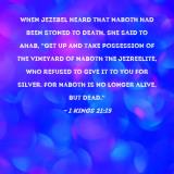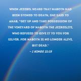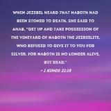 When Jezebel heard that Naboth had been stoned to death, she said to Ahab, "Get up and take possession of the vineyard of Naboth the Jezreelite, who refused to give it to you for silver. For Naboth is no longer alive, but dead."