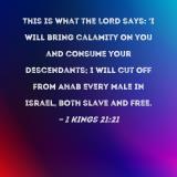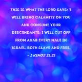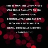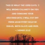 This is what the LORD says: 'I will bring calamity on you and consume your descendants; I will cut off from Ahab every male in Israel, both slave and free.