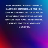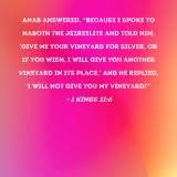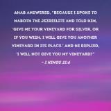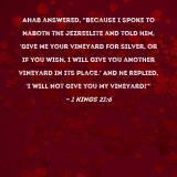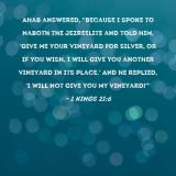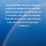 Ahab answered, "Because I spoke to Naboth the Jezreelite and told him, 'Give me your vineyard for silver, or if you wish, I will give you another vineyard in its place.' And he replied, 'I will not give you my vineyard!'"