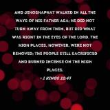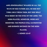 Pictures and Artwork And Jehoshaphat walked in all the ways of his father Asa; he did not turn away from them, but did what was right in the eyes of the LORD. The high places, however, were not removed; the people still sacrificed and burned incense on the high places. |