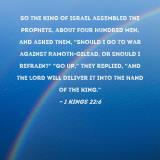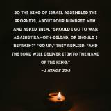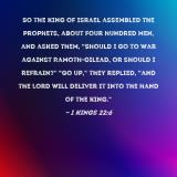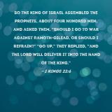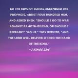 Pictures and Artwork So the king of Israel assembled the prophets, about four hundred men, and asked them, "Should I go to war against Ramoth-gilead, or should I refrain?" "Go up," they replied, "and the Lord will deliver it into the hand of the king." |