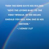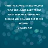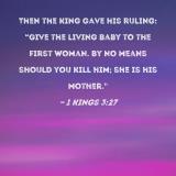 Then the king gave his ruling: "Give the living baby to the first woman. By no means should you kill him; she is his mother."