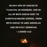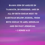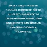 Baana son of Ahilud in Taanach, in Megiddo, and in all of Beth-shean next to Zarethan below Jezreel, from Beth-shean to Abel-meholah and on past Jokmeam;
