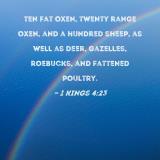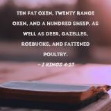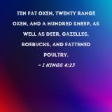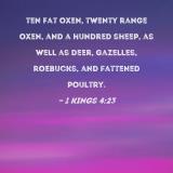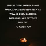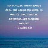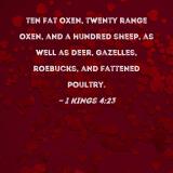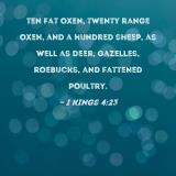ten fat oxen, twenty range oxen, and a hundred sheep, as well as deer, gazelles, roebucks, and fattened poultry.