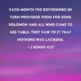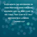 Each month the governors in turn provided food for King Solomon and all who came to his table. They saw to it that nothing was lacking.