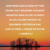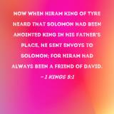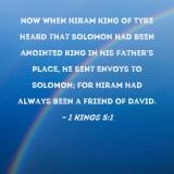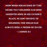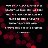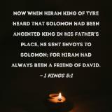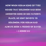 Now when Hiram king of Tyre heard that Solomon had been anointed king in his father's place, he sent envoys to Solomon; for Hiram had always been a friend of David.