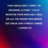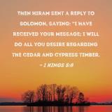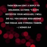 Then Hiram sent a reply to Solomon, saying: "I have received your message; I will do all you desire regarding the cedar and cypress timber.