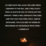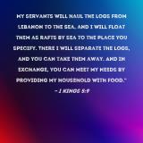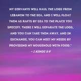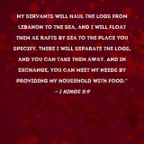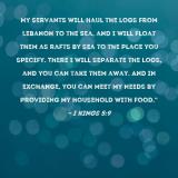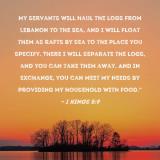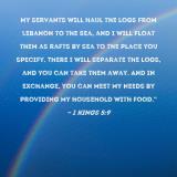 Pictures and Artwork My servants will haul the logs from Lebanon to the Sea, and I will float them as rafts by sea to the place you specify. There I will separate the logs, and you can take them away. And in exchange, you can meet my needs by providing my household with food." |