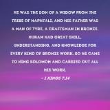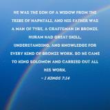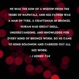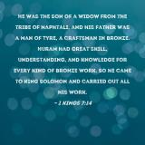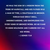 Pictures and Artwork He was the son of a widow from the tribe of Naphtali, and his father was a man of Tyre, a craftsman in bronze. Huram had great skill, understanding, and knowledge for every kind of bronze work. So he came to King Solomon and carried out all his work. |